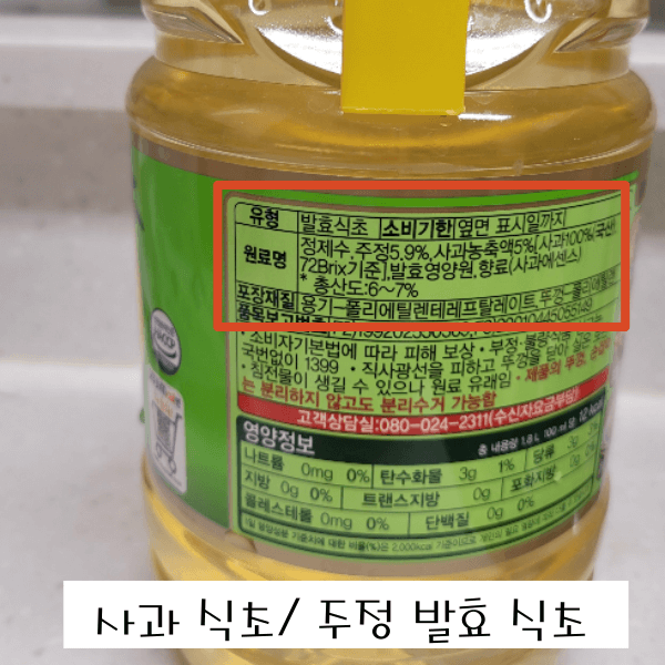 과일, 곡물 주정식초의 기준: 주정식초 1L 기준으로 과실 착즙액을 30% 이상 함유하거나 곡물 당화액이 4% 이상 함유되어야 함