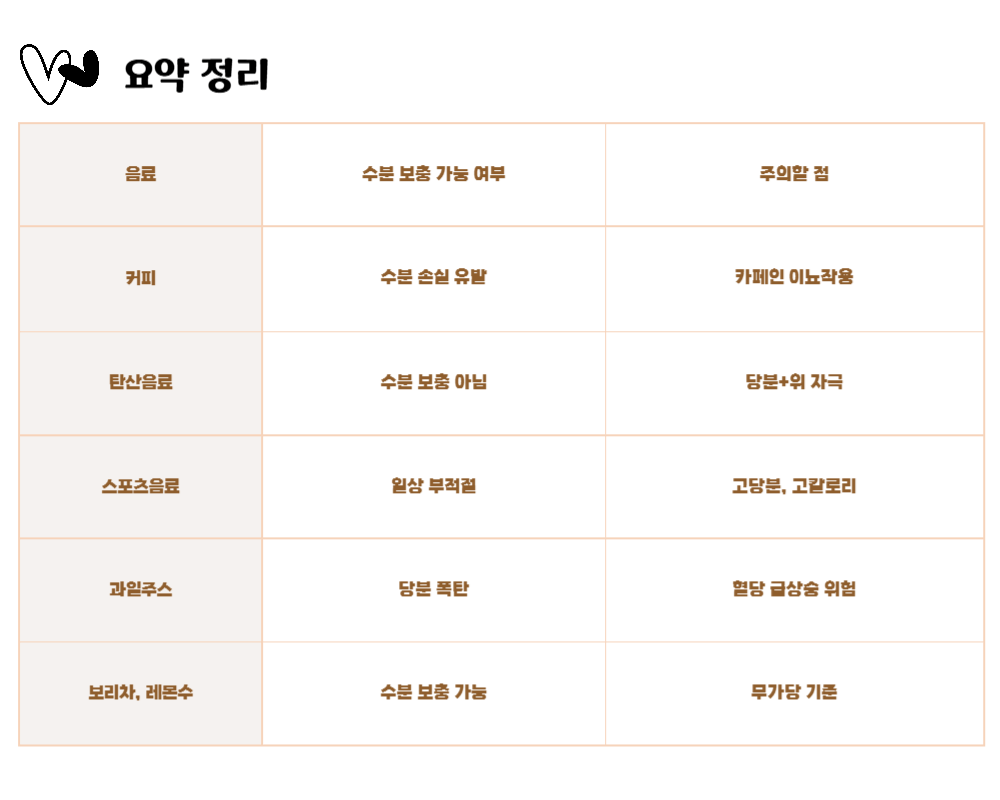 우리는 일상 속에서 탄산음료, 차, 커피, 이온음료를 물 대신 많이 마시고 있어요~  우리 몸은 매일 약 1.5~2L의 수분이 필요한데 이런 음료들이 수분 보충에 도움이 될까요? 오늘은 물 대신 마시면 안 되는 음료들과 그 이유를 알아봅시다!😍